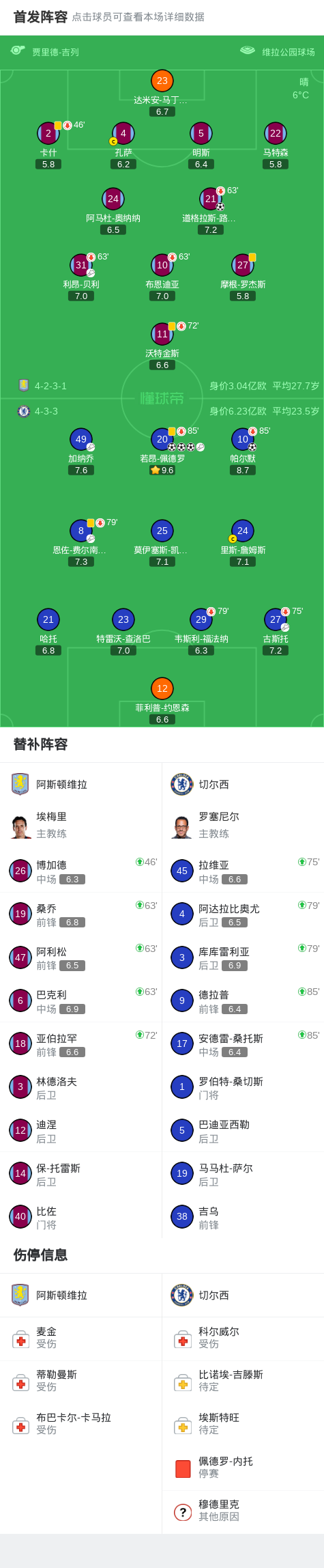 北京时间3月5日英格兰足球顶级联赛 第29轮,阿斯顿维拉主场对阵切尔西。上半场,路易斯开场闪击,随后,佩德罗连入两球,逆转比分。下半场,佩德罗助攻,帕尔默禁区内抽射破门。加纳乔无私助攻,佩德罗推射空门,上演帽子戏法。最终比分阿斯顿维拉 1-4 切尔西。关键事件第2分钟,贝利助攻,道格拉斯-路易斯门前巧射破门,维拉1-0切尔西第35分钟,扳平比分!古斯托助攻,...